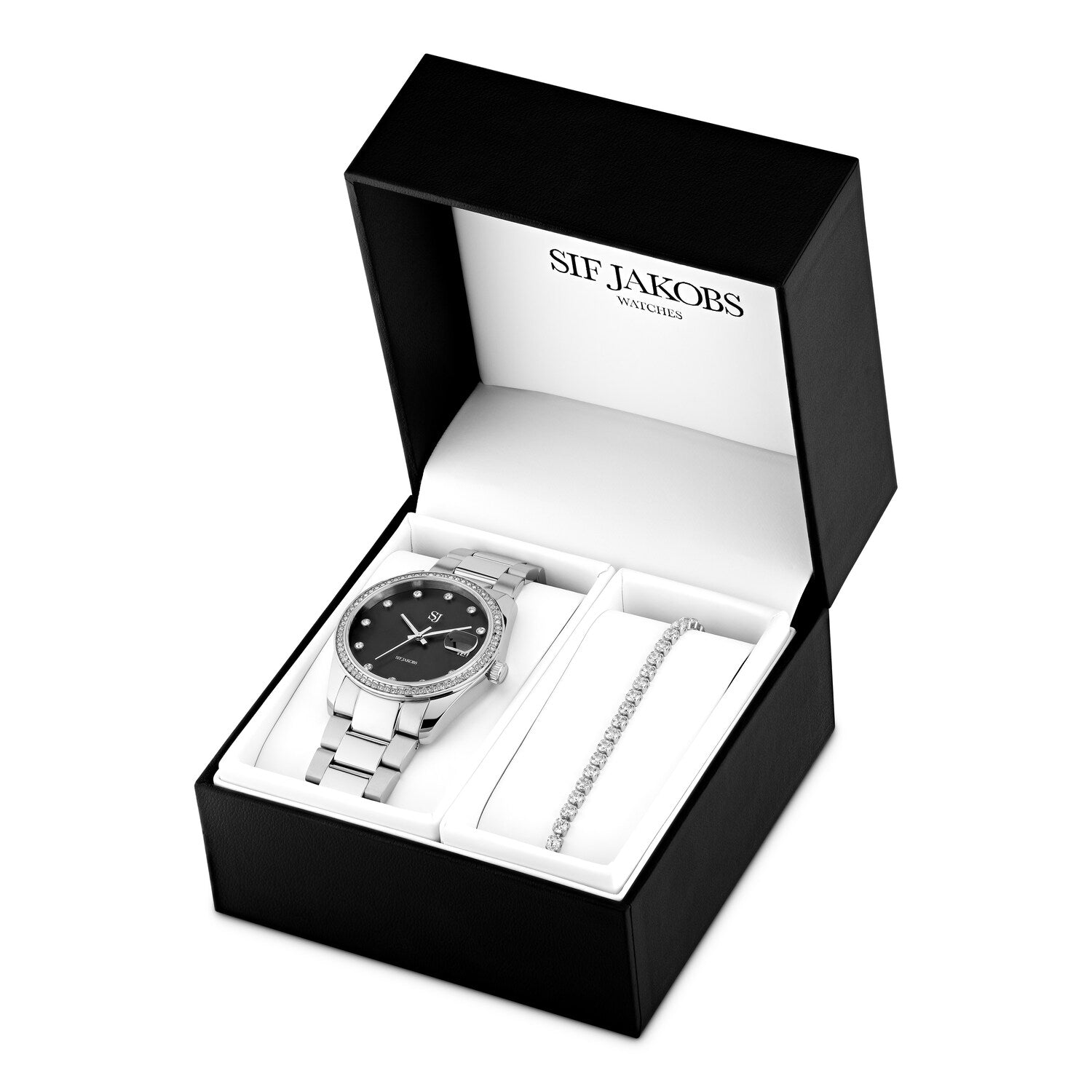 Aurora sætet fra Sif Jakobs Jewellery kombinerer elegance og funktionalitet i et tidløst design. Dette smukke sæt består af et poleret ur i rustfrit stål med hvide zirkoner og et matchende armbånd i 925 Sterling Sølv, der skaber en harmonisk og sofistikeret stil, der vil fange enhver opmærksomhed.