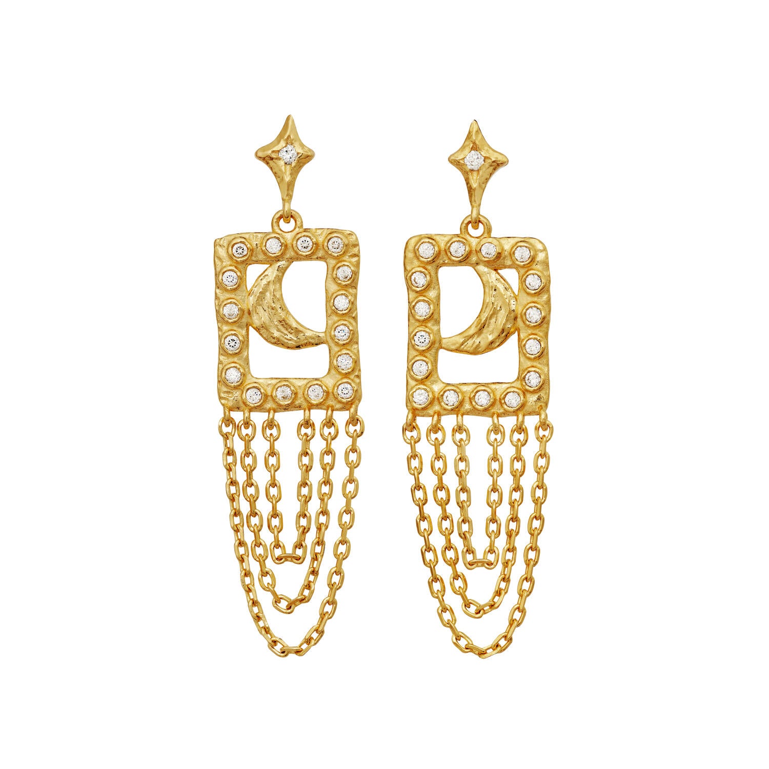 Barbra øreringene fra Maanesten fanger øjet med deres unikke design, der kombinerer naturinspiration med moderne sofistikering. Disse smukke hængeøreringe pryder ørerne med et rektangulært vedhæng omgivet af små funklende sten, der skaber et spændende spil af lys. I midten finder du en elegant månedetalje, mens en stjerneformet accent øverst tilføjer en magisk berøring. Ved enden hænger tre fine kæder, der bevæger sig let og danser ved hvert bevægelse, hvilket giver øreringene en levende og dynamisk kvalitet.