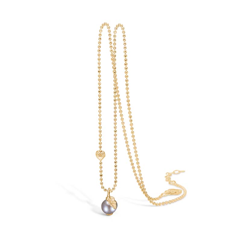 Det betyder, at du modtager Blossom 9 kt guld vedhæng med grå perle og blad, forgyldt kæde 45 cm uden bøvl og før, du ved det.