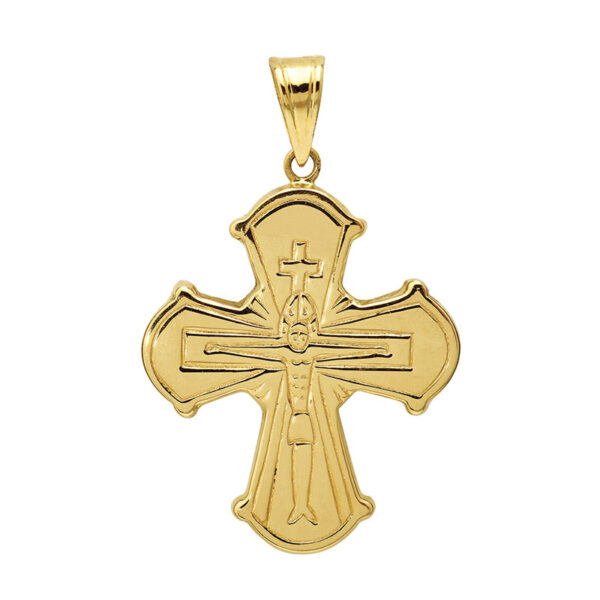 Dette smykke er mere end bare et smykke; det er et symbol på tro, håb og en dyb personlig forbindelse. Med sit elegante dobbelte design i ægte 14 karat rødguld skaber dette vedhæng en stærk følelse af nærvær og mening. Korsets detaljerede udskæring på forsiden viser Kristus på korset, mens bagsiden afslører fire ansigter – Jomfru Maria, Johannes Døberen og to andre hellige skikkelser – der sammen væver en fortælling om tro og frelse. Dette stykke er for den, der bærer sin overbevisning med skønhed og stolthed.