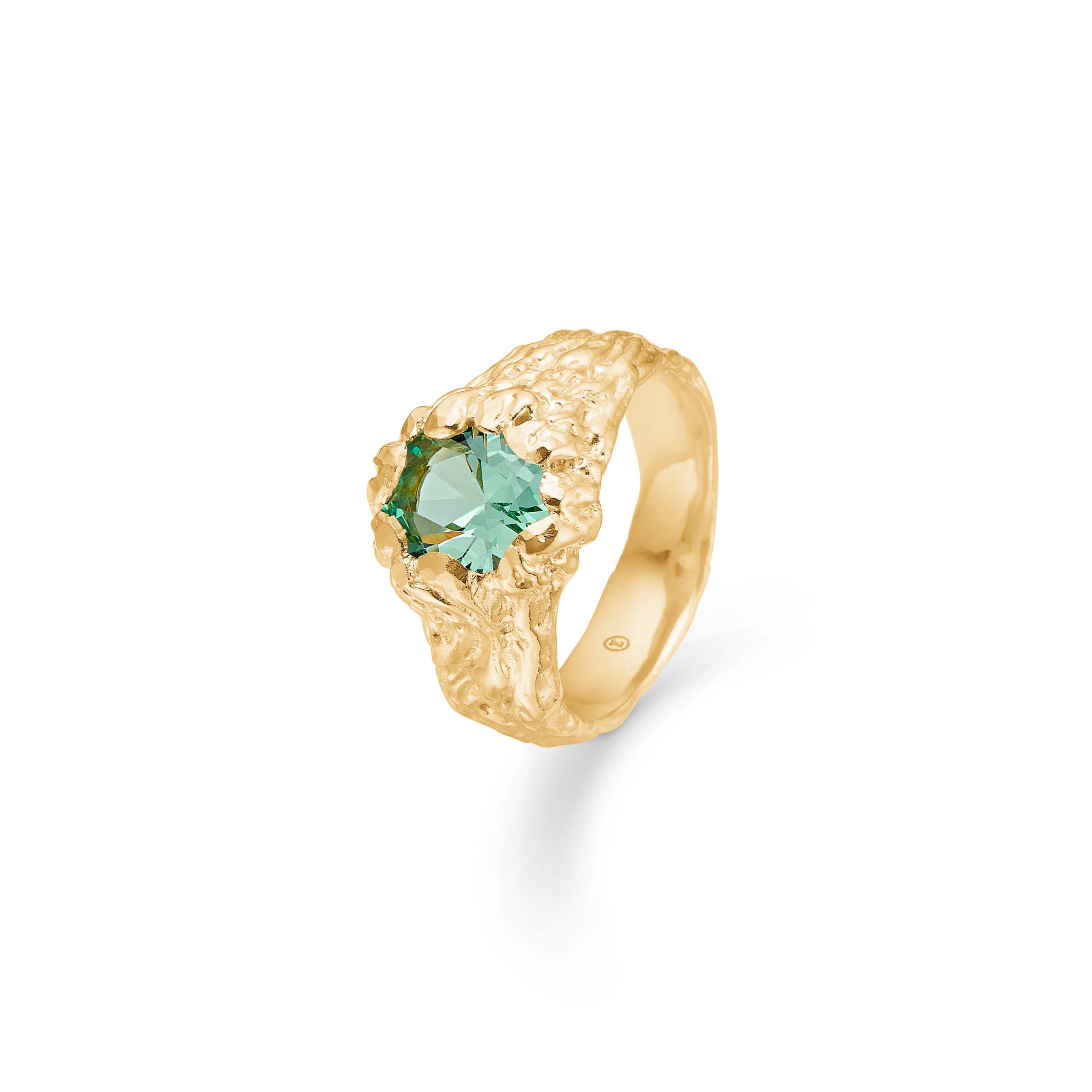 - Elegance i hvert detalje: Ringens rustiske struktur balancerer perfekt med den glatte forgyldte overflade, hvilket skaber en dynamisk æstetik. Den grønne zirkoniasten fungerer som et naturligt blikfang, der fanger lys og opfordrer til nysgerrighed. Uanset om du bærer den alene eller i kombination med andre smykker, vil den skabe en harmonisk og sofistikeret look.