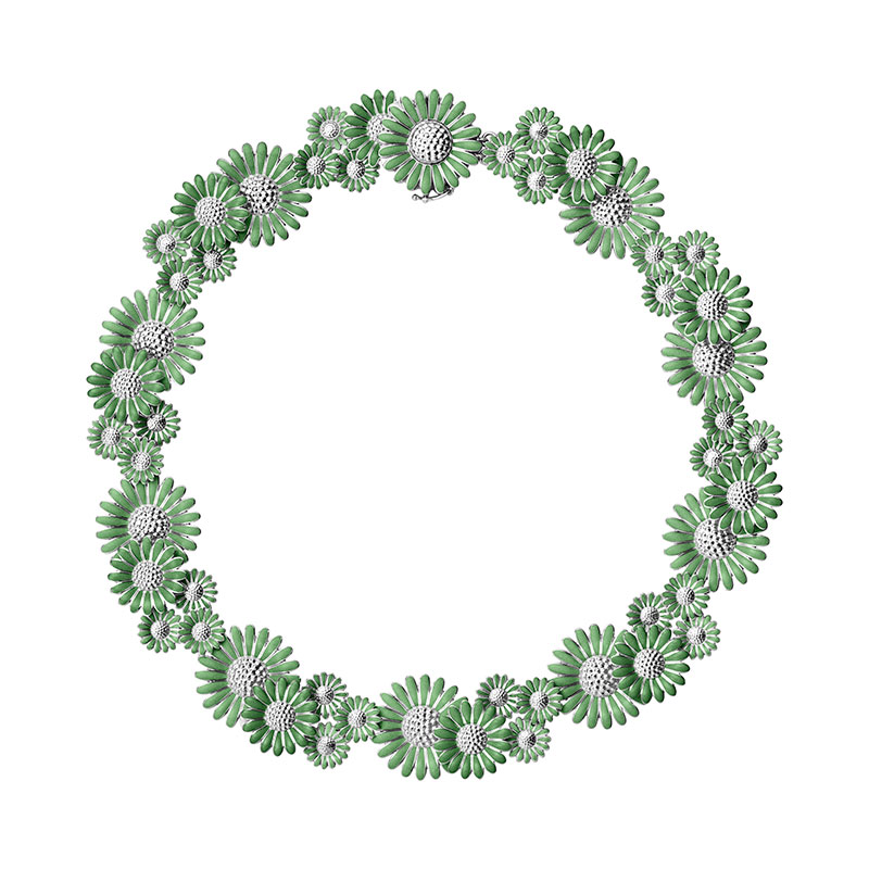 Denne Daisy Marguerit halskæde repræsenterer en harmonisk fusion af dansk designtradition og moderne modeinspiration. Som et resultat af det kreative samarbejde mellem Georg Jensen og den anerkendte designer Stine Goya præsenteres ikonet i en nyfortolket udgave, der bærer præg af begge verdener’ unikke DNA.