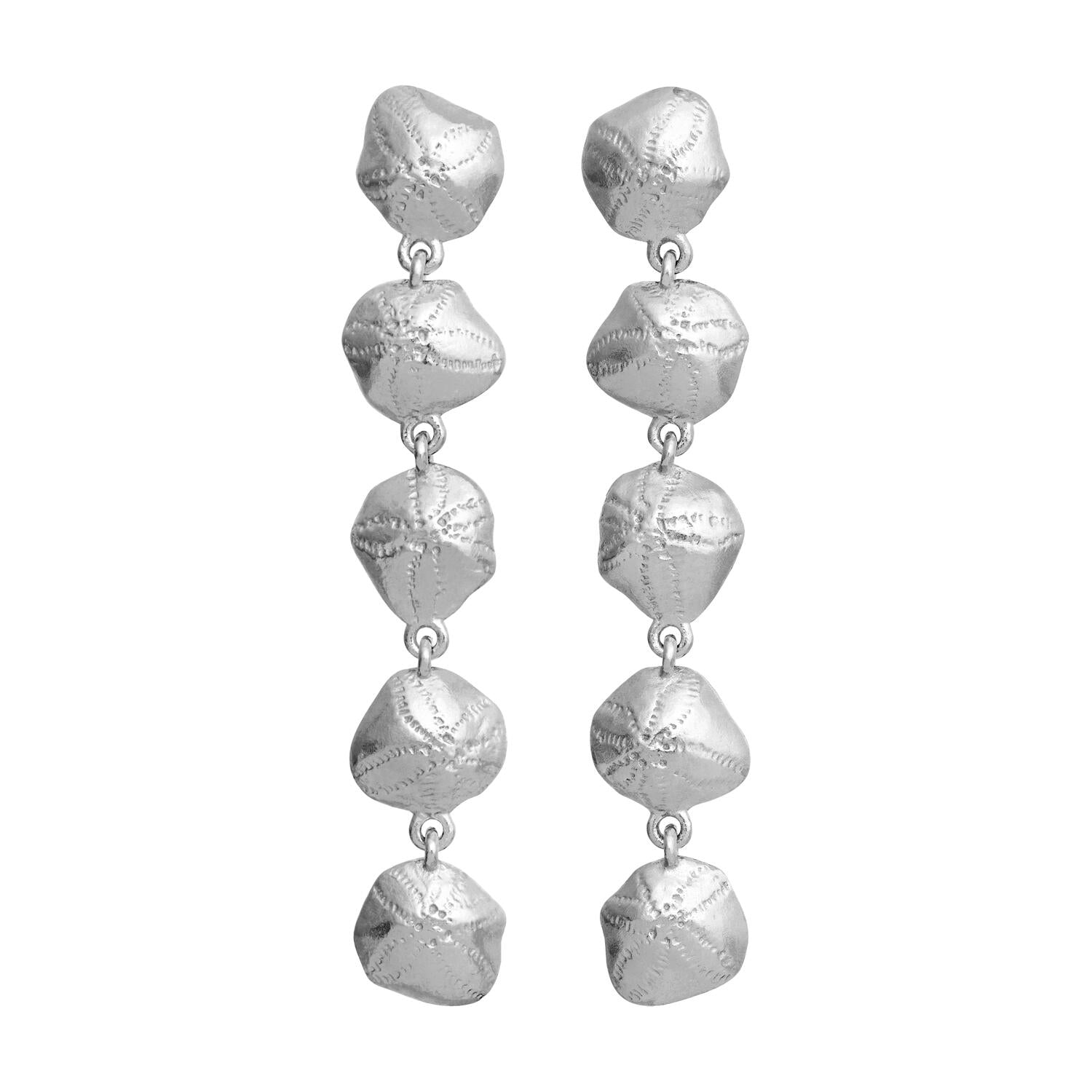 Designet er inspireret af skaller og fossiler, der er omformet til en kæde af vedhæng. Denne detaljerede bearbejdning giver øreringene et organiske udtryk, der er både moderne og tidløst. De kan bæres alene som et statement eller kombineres med andre smykker til et lag-på-lag look.