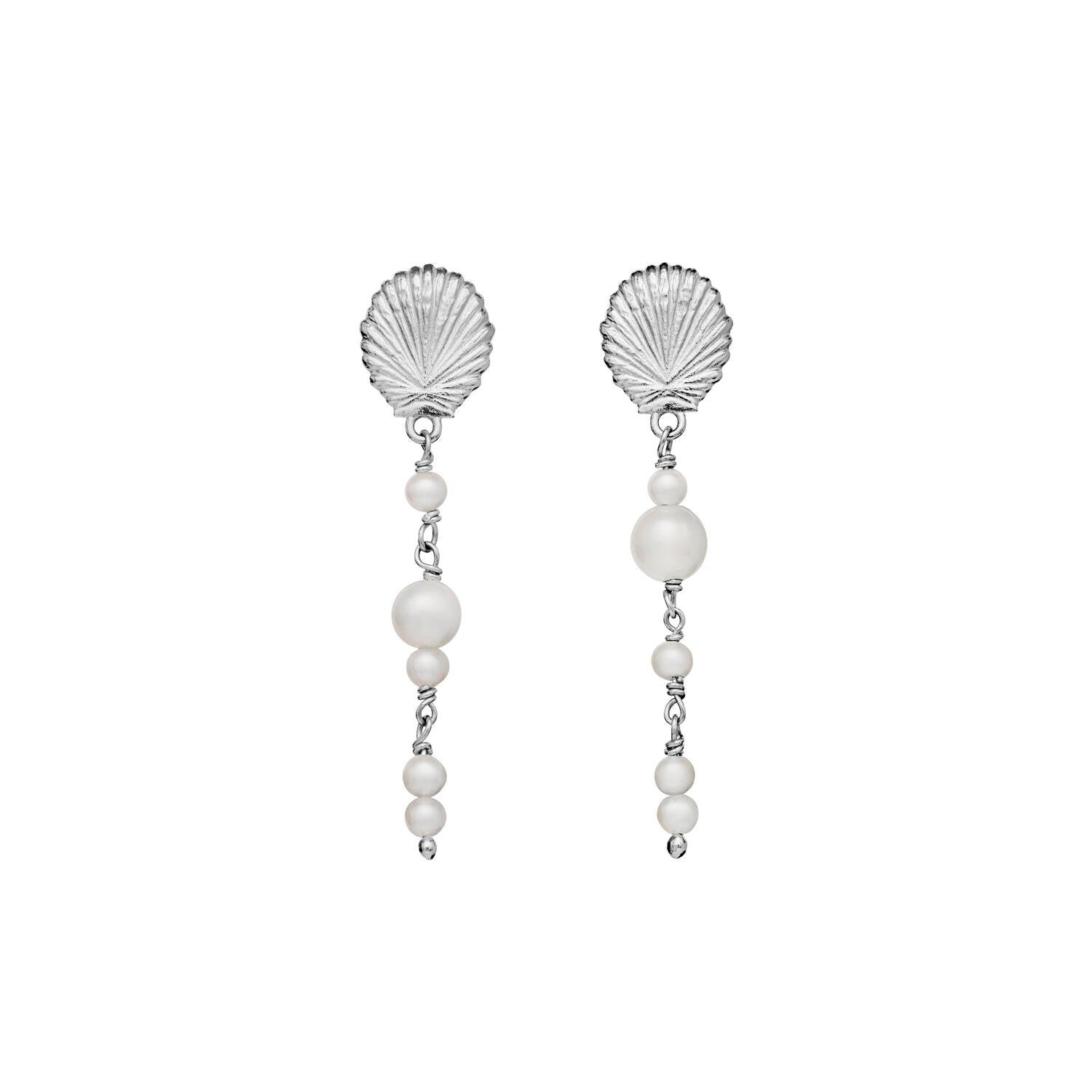 Disse Maanesten Marylyn hængeøreringe kombinerer bæredygtig elegance med håndværk. Fremstillet af genanvendt sterlingsølv med muslingeskalsformede ørestikke og perler i varierende størrelser. Skabt til fleksibel styling og komfort, de understreger organisk skønhed i hver detalje – perfekte til enhver lejlighed.