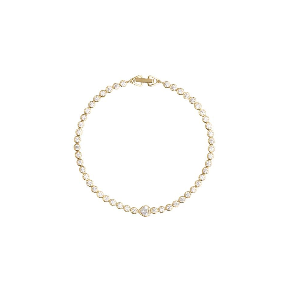Et tidløst armbånd med romantisk charm. Ophelia armbåndet kombinerer elegant design med funklende cubic zirconia-sten og en hjerteformet sten i midten. Fremstillet af 18 karat forgyldt sterlingsølv, giver det et varmt gyldent udseende og en holdbar overflade. Perfekt til både daglig brug og særlige lejligheder.