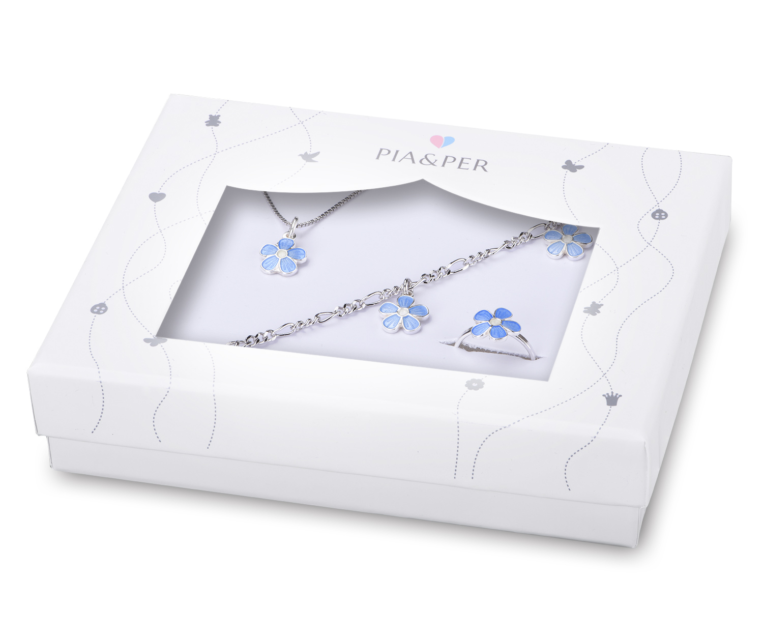Pia & Per blomster gavesæt med børnesmykker i sølv, lys blå