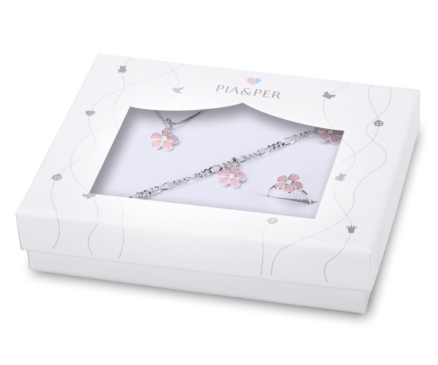 Pia & Per blomster gavesæt med børnesmykker i sølv, rosa er fra producenten mærke, som er famøse for at producere flotte, holdbare og smukke smykker, der kommer i flotte designs, og som derfor matcher godt ind i din garderobe og samtidig lever op til dine ønsker.