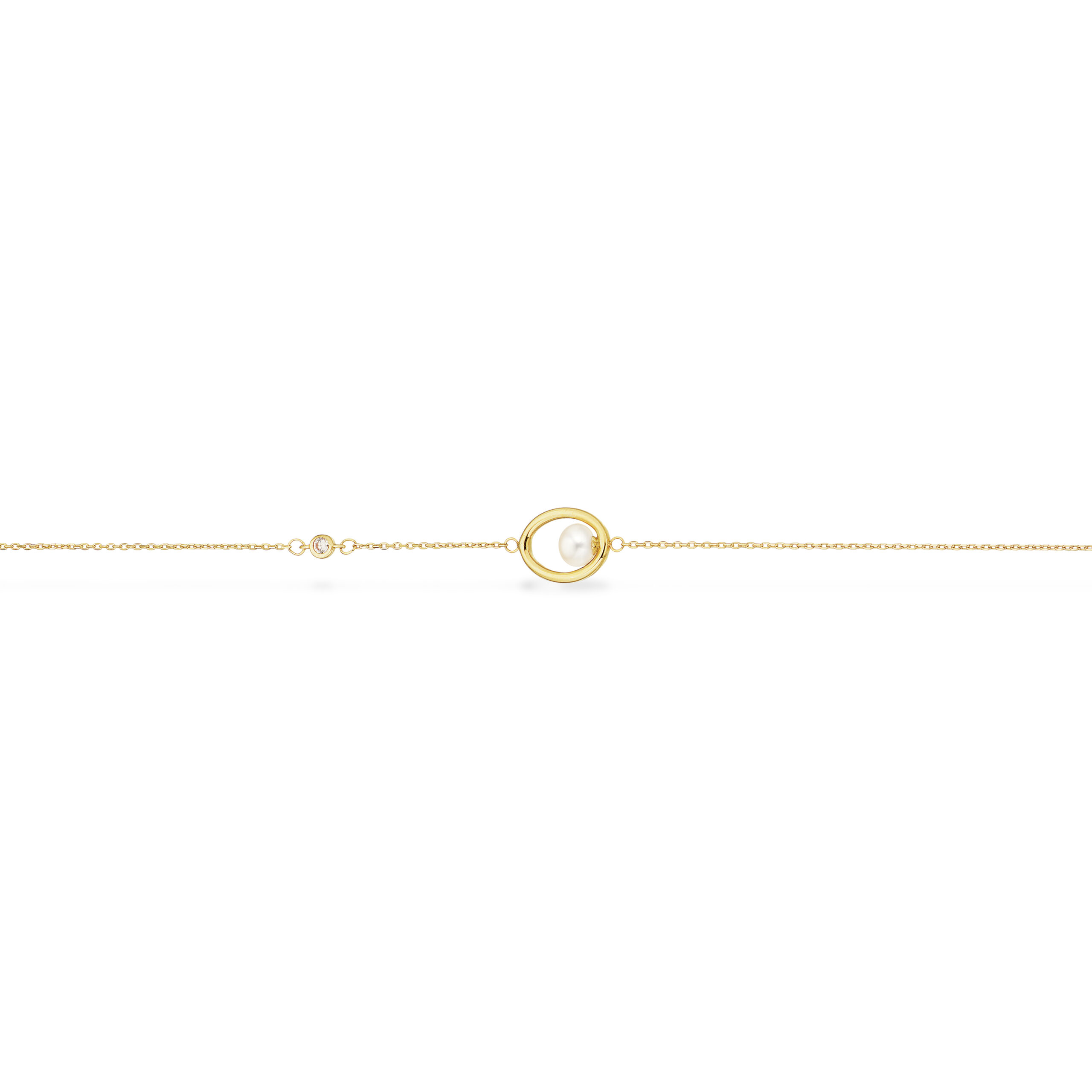 Det betyder, at du modtager Scrouples armbånd med ferskvandsperle og cubic zirkonia 17,5+1,5cm i 8 kt guld uden bøvl og før, du ved det.