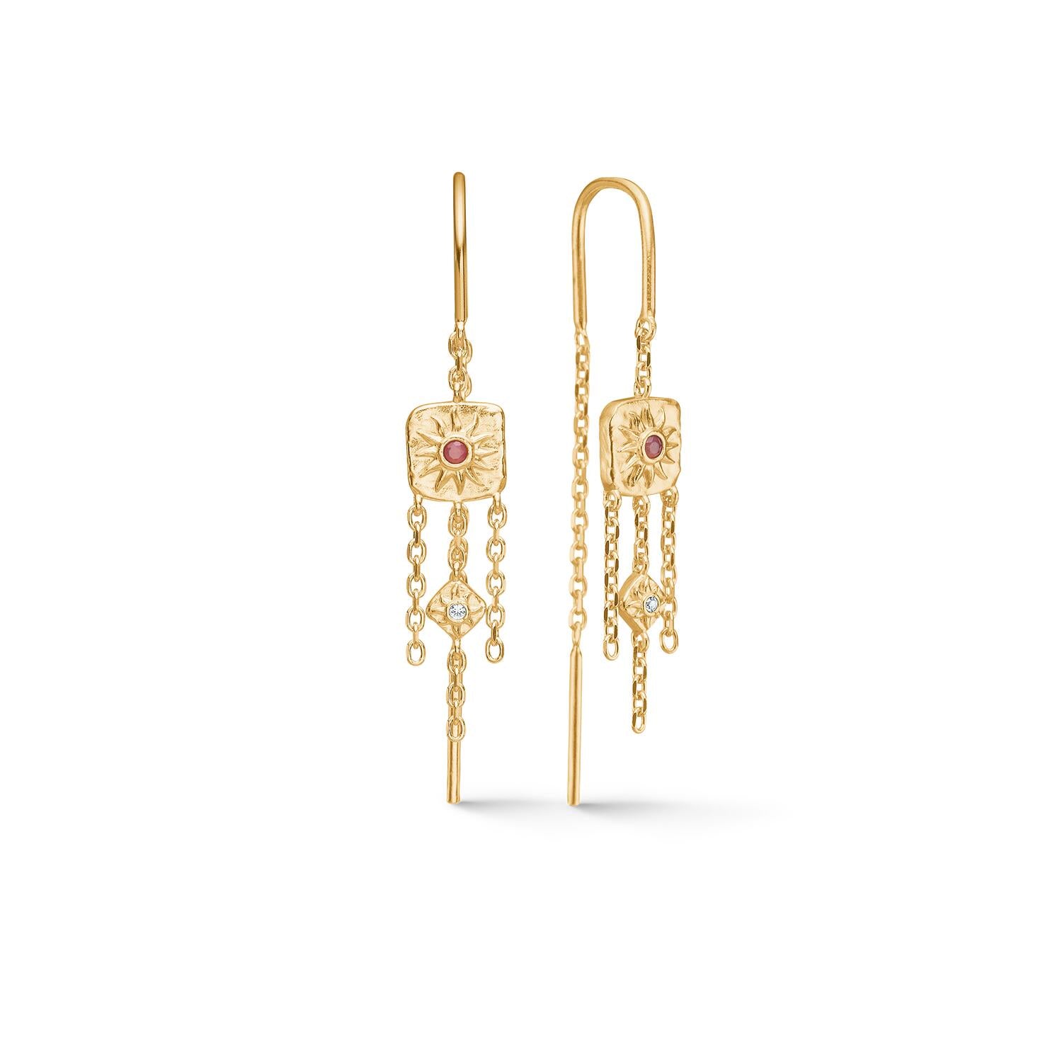 Solara hængeøreringe med elegant solstråle-inspireret design. De forgyldte øreringe har røde zirkonia, der opfanger lyset, og tre fine kæder, der skaber en rolig bevægelse. Perfekte til både daglig brug og festlige lejligheder.
